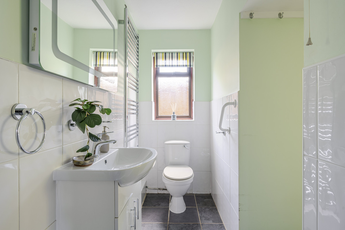 The bungalow boasts four double bedrooms, including a main bedroom with an en-suite shower room comprising a shower, sink, and WC. Large windows are carefully positioned to spill natural light into each room, enhancing the warm and welcoming atmosphere. A separate family bathroom serves the remaining bedrooms.