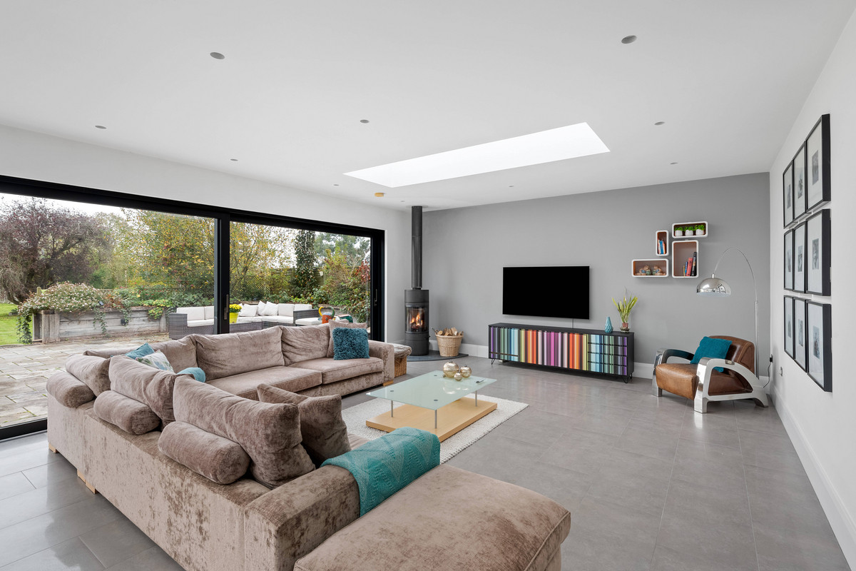 As you step through the grand entrance hall, you are welcomed into an expansive, open-plan kitchen, dining, and living area where natural light floods the space through folding doors that open to panoramic views of the lush countryside.