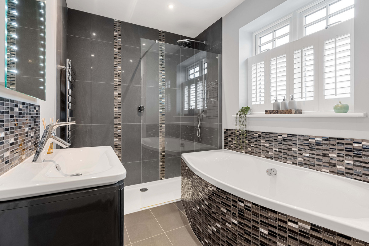 The home spans three stories, providing ample space for all family members. Each of the five bedrooms has been thoughtfully designed for comfort, with four featuring their own ensuite bathrooms, and the principal suite offering a dedicated dressing area. The top-floor suite provides a private, serene escape, enhanced by sweeping views and elegant finishes. A main family bathroom with a separate bath and shower serves the fifth bedroom, ensuring convenience and style for guests or larger families.