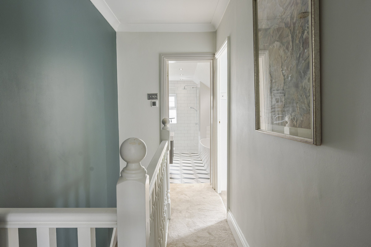 Upstairs, the property has two good size bedrooms, including a main bedroom with built-in wardrobes and plantation shutters, giving a smart and timeless finish. The bathroom combines traditional and modern design with Fired Earth floor tiles, crisp white subway wall tiles, a separate shower cubicle, an oval bathtub, and a modern vanity sink unit with storage.