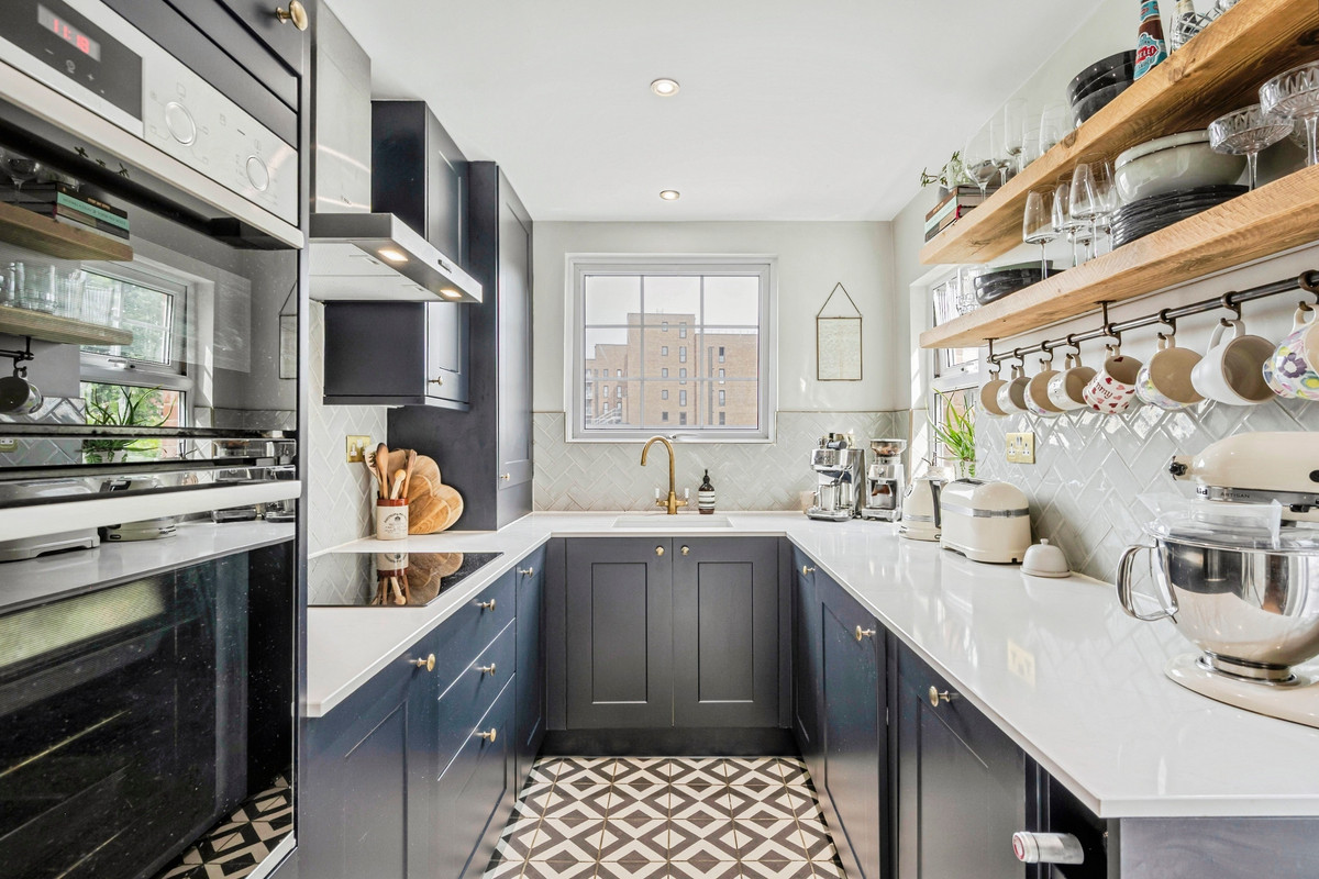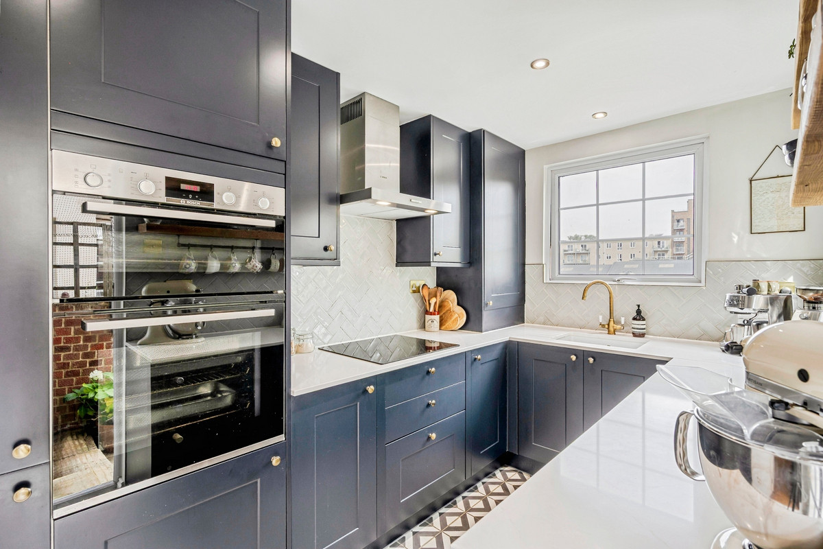 The modern kitchen is a real highlight: sleek navy cabinetry finished with brass handles and smooth, Italian Quartz, worktops, all complemented by handmade floor and wall tiles. High-quality integrated Bosch appliances, along with a Blomberg fridge and freezer, ensure practicality as well as style.