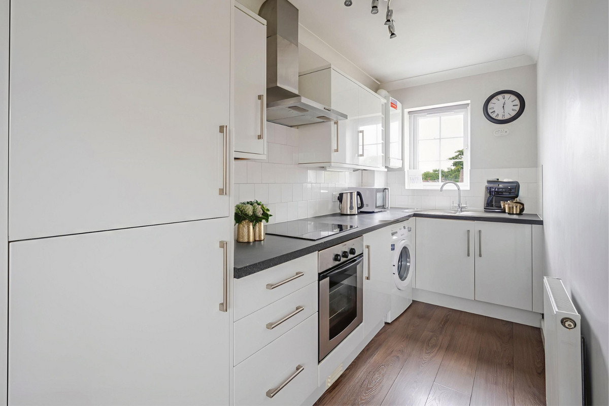 The heart of the home is the open-plan living and dining area, seamlessly connected to a modern galley-style kitchen. Finished with sleek, glossy white units, the kitchen includes an integrated fridge freezer, electric hob and oven, plus space for a washing machineoffering everything you need in one neat package.